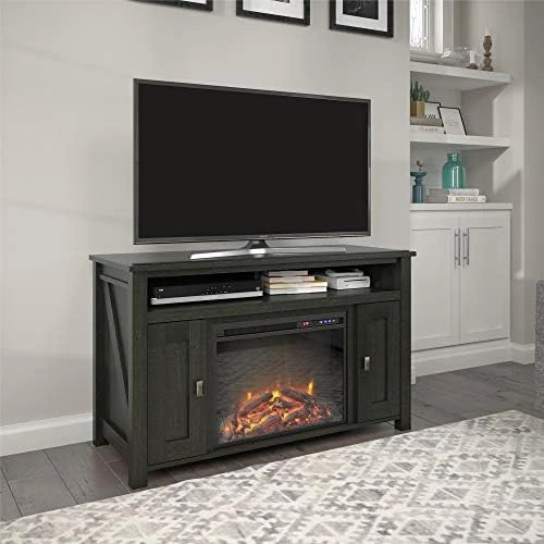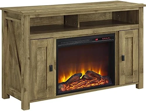 - Bring the outdoors in with the rustic look of the Ameriwood Home Farmington Electric Fireplace TV Console for TVs up to 60” wide or 95 lbs. The laminated MDF and particleboard build is a stunning weathered brown woodgrain for your rustic space