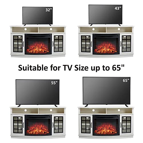 - [Dimension] Overall Dimension: 59″(W) x 32.2″(H) x 17.7″(D). Perfectly accommodates flat&curved screen TVs in the market, up to 65 inches, 90lbs. Electric fireplace Dimension: 26 “(W) x 21.26″(H).