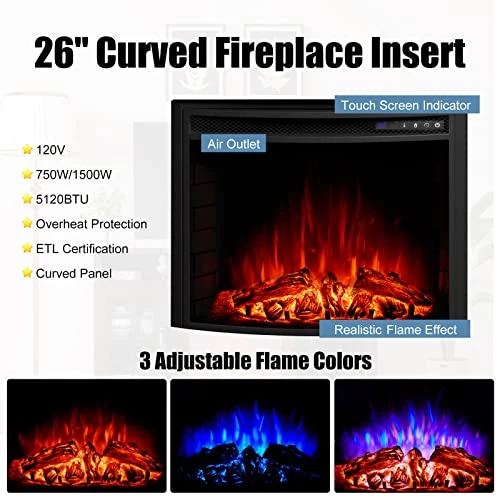 - [Electrical Fireplace] Comes with matching red brick finish inside and more realistic& thick 3D fire log. 3 flame colors and 6 levels dimmer can perform with or without heating. 5120 BTUs heat up to 400 sq. ft. Safety secure: Overheat protection and ETL certification.