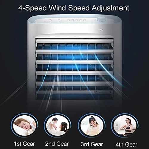 - ❆【4 Speeds】This portable evaporative cooler is dedicated to help you achieve a more comfortable climate. 4 adjustable wind speeds, you can choose the wind speed you want at different temperatures and occasions. While you are sleeping, first gear will bring you a natural breeze, and avoid getting cold thru the night.