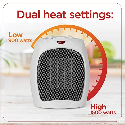 - HEATER + FAN COMBO – This small heater and fan is ultra compact but powerful. At only 7.5 x 6.3 x 9.5 in., it fits on your dorm or office desk, bedroom table, basement, garage worktable, RV shelf – just about anywhere you need extra heat