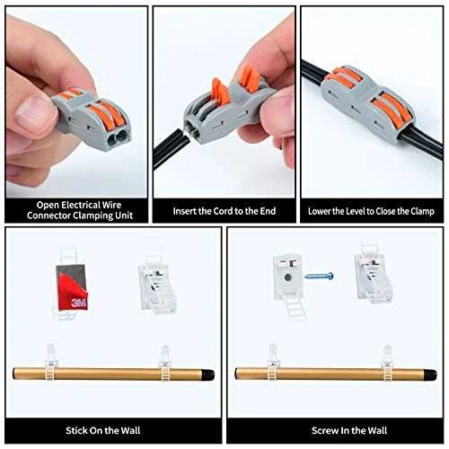 - OPTIMIZATION IN INSTALLATION: There is configured with a connector clamp to combine two halves of an electrical wire. Furthermore, after fixing rods by ashesive cable ties, you can either stick ties on the wall or screw them into the wall with tapping screws