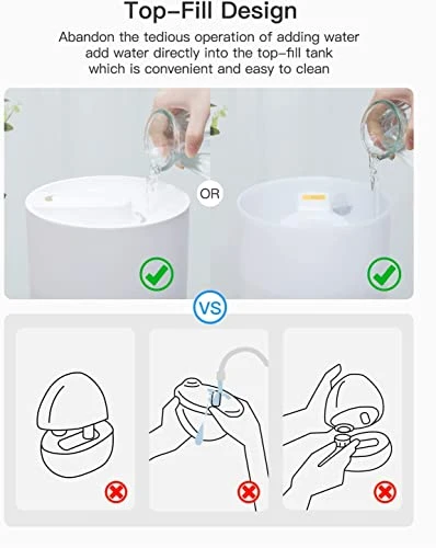 - Easy Top-Fill & Auto Shut-Off: Top filling design is convenient to refill and easy to clean. Simply open the top cover to add clean water directly to the water tank through the wide opening top. The cutout design on the top cover allows you to add water directly without opening the lid while the device is working. When the water runs out, the humidifier for bedroom for home will power off automatically, ensure your safety and preventing unit damage when it runs out of water.