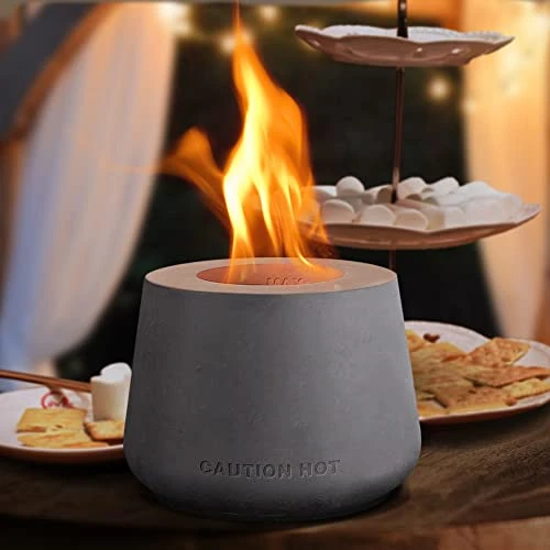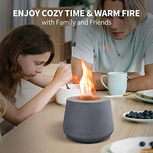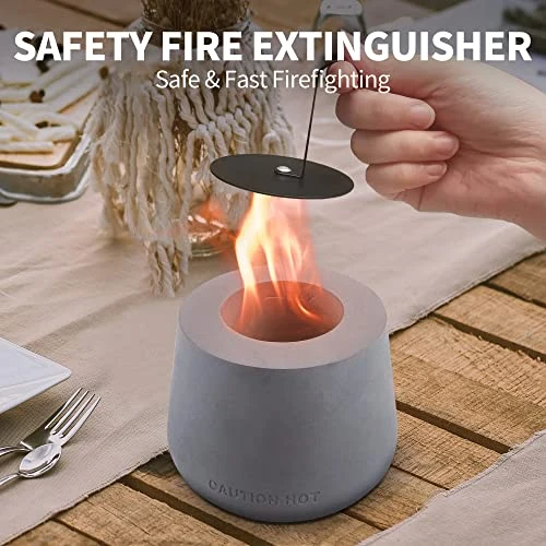 - 🔥 SECRETS OF THE FLAME: Durx-Litecrete is equipped with a metal safety fire extinguisher tool to safely and quickly put out fires in the tabletop fire pit. Use clean alcohol fuels will keep your flame burning continuously for 40-50 minutes (burn time depends on climate and temperature) provide a golden 7in smoke-free flame at 3000 BTUs and will not create a dirty environment.