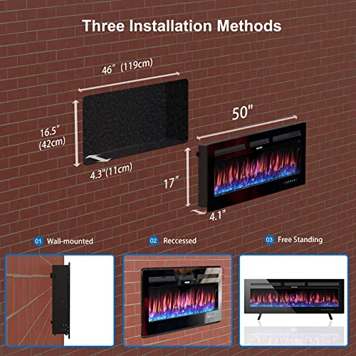 - 【3 manners of Installation】: This electric fireplace not only can be recessed or insert in wall but also can be Wall Mounted or just freestanding with our allocated stands. A detail user manual is provided while you install our fireplace.You can also see our videos to see how it works.Suggested Cutout Dimensions: 26.8″ W x 6.3″ D x 17.1″H