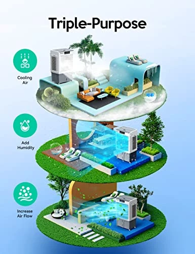 - 【Larger Coverage】With its 120° oscillation, this portable swamp cooler can handle spaces of up to 950 square feet, puts out 3000 cubic feet of cold air a minute, effectively distributes the cold air all throughout the space.