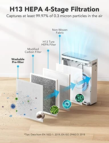 - 4-Stage Filtration: The H7123 air purifier for bedrooms contains H13 HEPA filter and 30% more carbon. Decompose odor and filter particles such as PM 2.5 more efficiently. The washable pre-filter reduces clogging and extends filter life by 6-8 months.