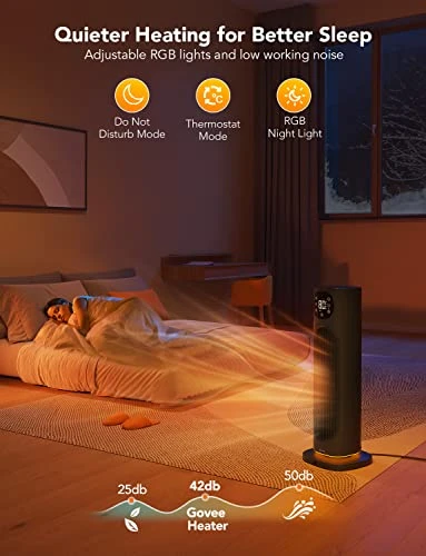 - Low Noise & RGB Night Light: In Sleep Mode, the sound of the Govee space heater working is lower than 40dB. Change the different modes of light via Govee Home APP to warm your whole night.