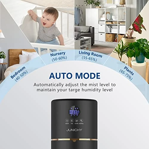 - 【Humidifier for Large Room Home up to 2000 sq ft 】45% to 75% Customize humidity (adjust 5% per touch).The built-in humidistat sensor can monitor and detect the ambient humidity value (error ±5%). LARGE & SMALL ROOM WORKS BOTH.Constant moisture for more than 90 hours available in dry season.Whole -house digital humidifier.AUTO-OFF MIST IF REACH PRESET HUMIDITY;RESTART MIST IF BELOW WANTED HUMIDITY.
