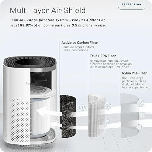 - SOOTHE ASTHMA + ALLERGY + HAY FEVER: Filters pollen, wildfire smoke, pollution, bacteria, mold spores, dust, pet allergens, food smells, unpleasant odors and moreโฆ in minutes! The H13 True HEPA Filter works alongside the Pre-Filter and High-Efficiency Activated Carbon Filter to capture 99.97% of airborne particles 0.3 microns.