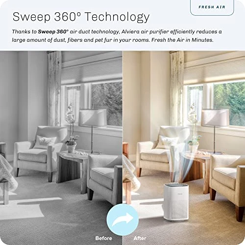 - SUPER EASY AND FAST SET-UP: Modern aesthetic with easy-to-use touch screen. Fits anywhere and features wide coverage with SWEEP360ยฐ air-duct design. Alviera refreshes the air 5 times per hour in rooms as large as 219 ftยฒ / 20 mยฒ, 3 times per hour in rooms as large as 397tยฒ / 37 mยฒ.