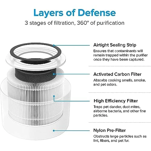 - IMPROVED FILTRATION: While the ultra-fine Nylon Pre-Filter and High-Efficiency Activated Carbon Filter capture large particles and absorb odors and fumes, the HEPA filter of the 3-in-1 filter removes at least 99.97% of dust, pollen, and any airborne particles with a size of 0.3 microns (µm)