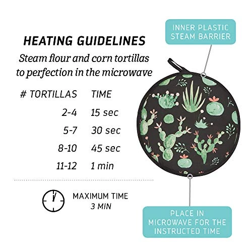 - TABLE READY: These cotton tortilla warmers with 11 in. diamater feature an adorable print that will delight any dinner or party guest. The special pocket conceals extra tortillas on the table while keeping them warm and ready-to-eat. Care: Machine wash cold, lay flat to dry.