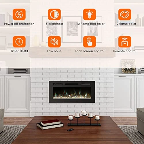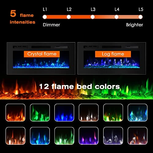- MULTI OPERATING MODES: The electric fireplace inserts can be controlled not only by the LED touch screen but also by a remote control. There are 6 buttons on the remote control, including switch, temperature adjustment , brightness adjustment , color adjustment , timer setting and power adjustment .What’s more, a built-timer can be used to operate the device up to 8 hours.
