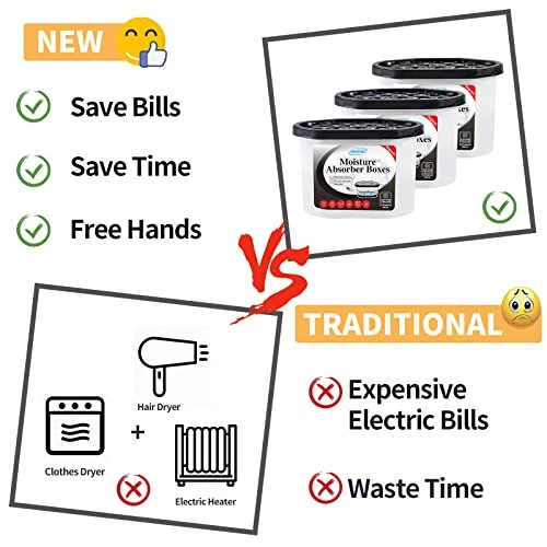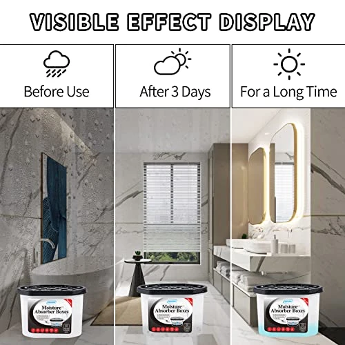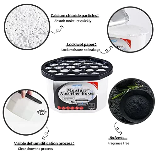 - ❤Easy to Use : No need assemble, When you start to use the moisture absorber, you only need to open the plastic mesh lid, tear off the aluminum foil protective film, and then put the plastic mesh lid back in place, and you are done. Each moisture absorber is individually packaged for easy use and long term storage.