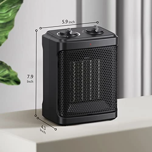 - 【Compact Heater Dimensions】: 5.9X 4.3 x 7.9 inch. Portable mini heater with build in carry handle easy to carry. Adjustable thermostat for comfortable warmth, ideal for small areas. The length of the cord is about 6ft to allow for unobstructed use