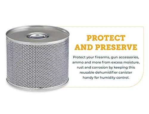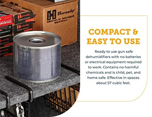 - Compact, Easy to Use – ready to use gun safe dehumidifiers with no batteries or electrical equipment required. It easily recharges in a warm oven for infinite reuse. Measures: 5 inches D x 4 inches H Effective Volume: 57 cubic feet