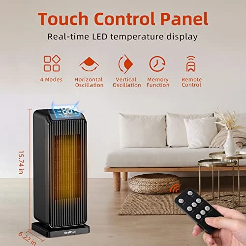 - ✅【120° Cover Range, Warm Room Quickly】RealPlus space heater could oscillate from left to right about 70° but cover 120° range, and oscillate from up to down about 70° range, warms your room quickly and covers more areas, the only thing you need to do is press the button on heater panel or remote control. In addition, The heater is fitted with a washable dust filter which blocks out any dust, airborne particles and impurities, providing you with clean air and comfortable warmth.
