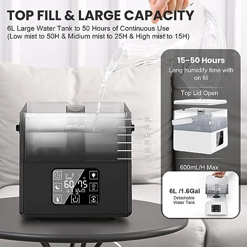 - Remote Control & Timer – With convenient remote control access, you can easily adjust Terrug humidifier settings no matter where you are in the large room. The 1-12H timer gives you more time to choose from, so you don’t have to worry about accidentally turning on the large humidifier, providing you with a rest assured and comfortable sleeping environment.