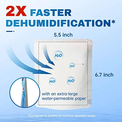 - EFFICIENT ABSORPTION: Vacplus humidity absorber bags feature a large water-permeable paper on the back measuring 5.5″x6.7″, which can maximize the moisture-absorbent area. Thus, these standing dehumidifier bags absorb moisture up to 2 times faster than traditional dehumidifier boxes. Moreover, the absorbent paper can prevent the solution from leaking for a better dehumidifying effect.