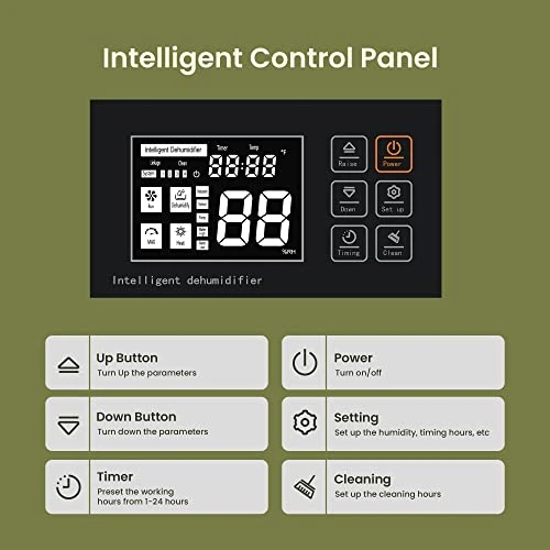 - INTELLIGENT CONTROL FOR EFFECTIVE OPERATION: Waykar industrial dehumidifier comes with a simple clear digital touch control panel, anyone could operate it easily. Humidity Auto Control: Simply adjust to your ideal moisture setting, it will smartly sense room humidity and control dehumidification to maintain pre-set humidity levels. 24-hour Timer: For preset operation and reduced energy consumption, effectively absorb moisture without racking up your energy bill. Set up the humidity level at 10% RH, enter continuous dehumidifying mode.