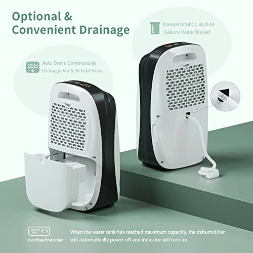 - EASY TO USE: Auto Drain – The unit comes with a 6.56 feet drain hose that you can attached to the drain pipe hole to continually drain water that is dehumidified. Manual Drain – The water tank is 0.48 Gal, when it reaches maximum capacity, the “Full Tank” indicator will light up, the dehumidifier will automatically switch off until the tank has been emptied. Meanwhile, a reusable and washable filter preserves fresh and clean air quality.